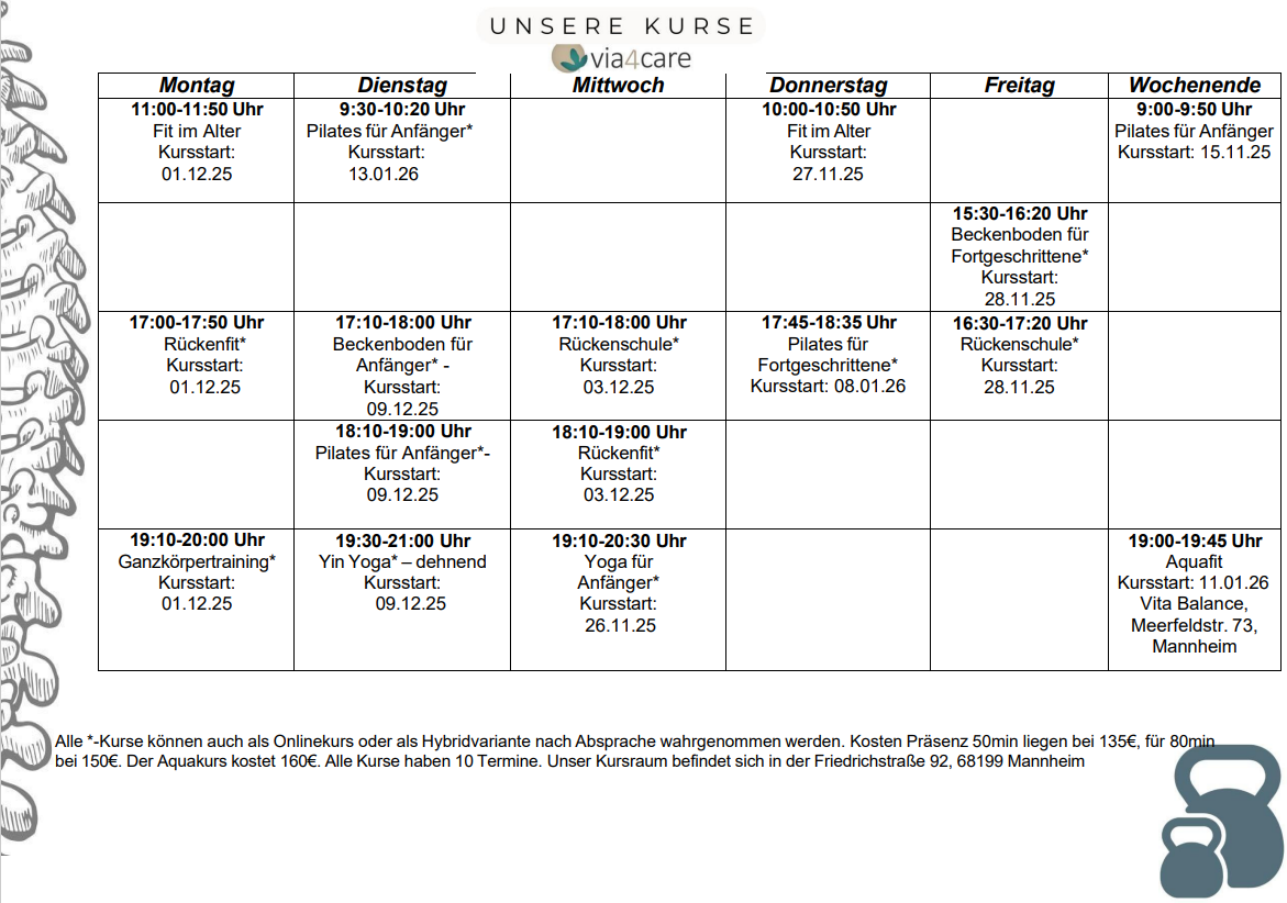 Entdecken Sie unsere umfassenden Kursangebote bei via4care! Wir bieten hochwertige Physiotherapie und Osteopathie in Mannheim, Ludwigshafen und Weinheim sowie online an. Egal, ob Sie in einer unserer Praxisstandorte oder bequem von zu Hause aus teilnehmen möchten, unsere erfahrenen Fachkräfte stehen Ihnen zur Verfügung, um Ihnen dabei zu helfen, Ihre Gesundheitsziele zu erreichen. Buchen Sie noch heute Ihren Kurs und starten Sie Ihren Weg zu einem gesünderen Leben!