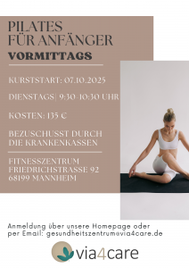 Kursstart am 02.10.2025 – für Anfänger geeignet Kosten 135€ / 10 Einheiten – bezuschusst durch die Krankenkassen! Der Kurs findet donnerstags in der Zeit von 18:00 – 19:00 Uhr im Fitnesszentrum, Friedrichstraße 92, 68199 Mannheim statt. Weitere Informationen unter gesundheitszentrum@via4care.de oder per Telefon unter 0621-17858890 oder 0159-067 87 977. Eine Anmeldung zum Kurs kann direkt