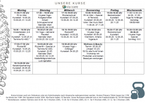 Hier finden Sie unseren neuen Kursplan ab Mai 2025. Ein Einstieg in die Kurse ist nach Rücksprache jederzeit möglich. Anmeldung Direkt über unsere Homepage unter „Kurse“. Wir freuen uns auf Sie und Euch! Anmeldung
