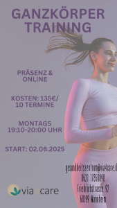 Kursstart am 02.06.2025 Kosten 135 € – bezuschusst durch die Krankenkassen! Der Kurs findet montags in der Zeit von 19:10 – 20:00 Uhr im Fitnesszentrum, Friedrichstraße 92, 68199 Mannheim statt. Weitere Informationen unter gesundheitszentrum@via4care.de oder per Telefon unter 0621-17858890 oder 0159-067 87 977. Eine Anmeldung zum Kurs kann direkt über unsere Homepage erfolgen. Wir freuen