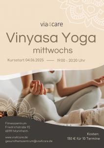 Kursstart am 04.06.2025 – auch für Anfänger geeignet Kosten 150 € – bezuschusst durch die Krankenkassen! Der Kurs findet mittwochs in der Zeit von 19:00 – 20:20 Uhr im Fitnesszentrum, Friedrichstraße 92, 68199 Mannheim statt. Weitere Informationen unter gesundheitszentrum@via4care.de oder per Telefon unter 0621-17858890 oder 0159-067 87 977. Eine Anmeldung zum Kurs kann direkt über