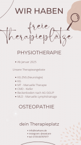 Wir haben ab Januar 2025 freie Therapieplätze. Physiotherapie – KG ZNS (Neurologie) – Krankengymnastik – Manuelle Therapie – CMD – Kiefer – Beckenboden nach AG GGUP – Manuelle Lymphdrainage Osteopathie Weitere Informationen unter info@via4care.de oder telefonisch unter 0159/06787977. Anmeldung zu den Kursen
